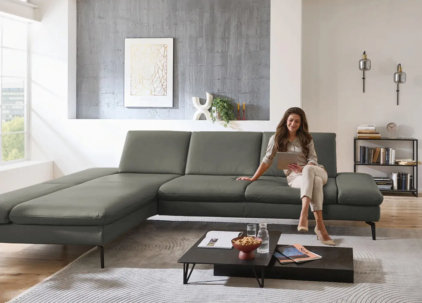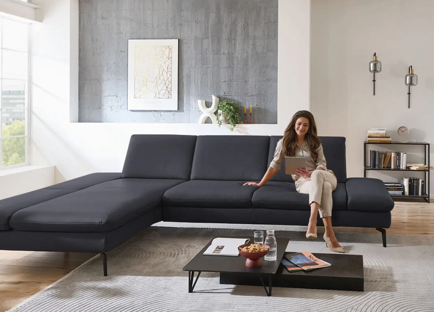 Gestalte dein Traumsofa - von der U-Form bis zur Sofaecke, mit vielen Farbvarianten in Leder und Stoff sowie verschiedenen Fußdesigns.